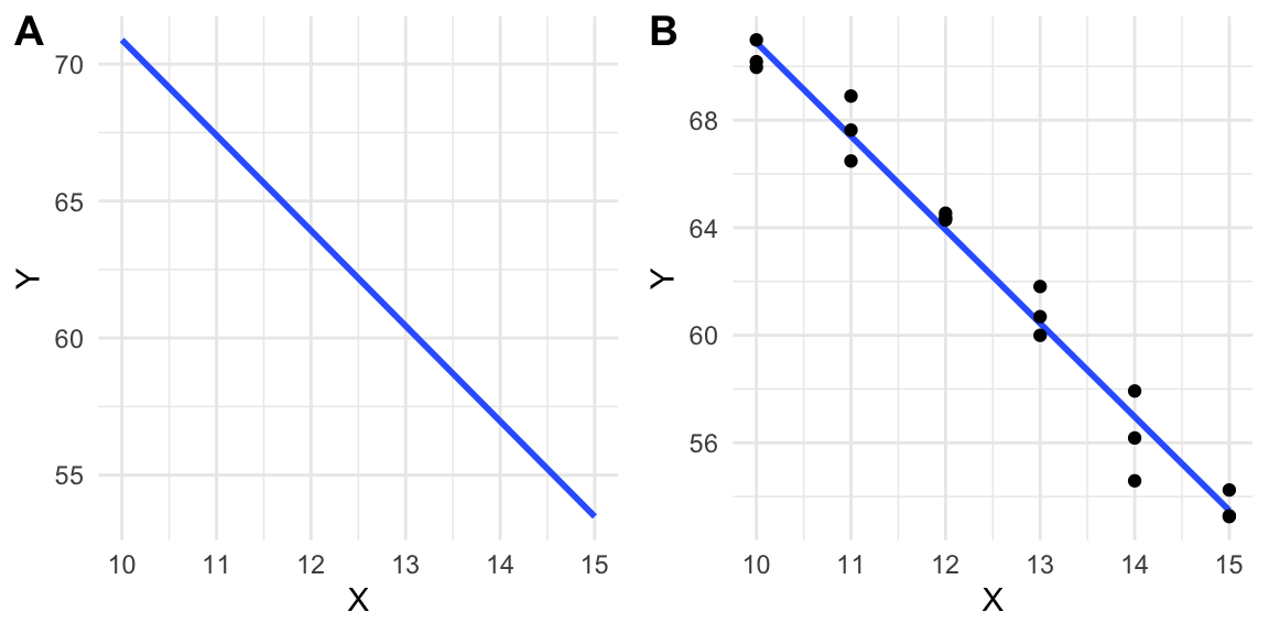 A linear model is a function, like that in Equation 8.1, that is fit to a set of data, often to model a process that generated the data or something like the data. The line in Figure 8.1 A is just that, a line, but the line in Figure 8.1 B is a linear model fit to the data in Figure 8.1 B.