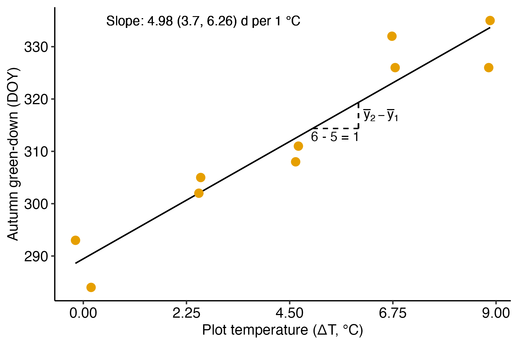 A linear model fit to data with a numeric (continous or discrete) \(X\) is classical regression and the result is typically communicated by a regression line. The experiment introduced in (linear-models-with-a-single-continuous-x?, Linear models with a single, continuous X) is a good example. In this experiment, the researchers designed an experiment to measure the effect of warming on the timing of photosynthetic activity. Temperature was experimentally controlled at one of five settings (0, 2.25, 4.5, 6.75, or 9 °C above ambient temperature) within twelve, large enclosures. The response variable in the illustrated example is Autumn “green-down”, which is the day of year (DOY) of the transition to loss of photosynthesis. The intercept and slope parameters of the regression line (Figure (Figure 8.2)) are the coefficients of the linear model. The slope (4.98 days per 1 °C added warmth) estimates the effect of warming on green-down DOY. What is not often appreciated at the introductory biostatistics level is that the slope is a difference in conditional means. Any point on a regression line is the expected value of \(Y\) at a specified value of \(X\), that is, the conditional mean \(\mathrm{E}(Y|X)\). The slope is the difference in expected values for a pair of points that differ in \(X\) by one unit.