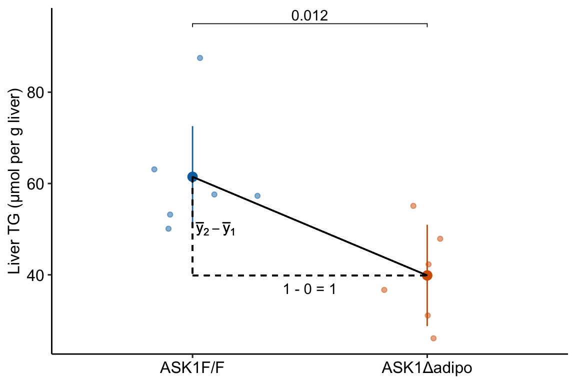 The solution to using a linear model with categorical \(X\) is to recode the factor levels into numbers. An example of this was outlined in Chapter Chapter 1. The value of \(X\) for individual mouse i is a number that indicates the treatment assignment – a value of 0 is given to mice with a functional ASK1 gene and a value of 1 is given to mice with a knocked out gene. The regression line goes through the two group means (Figure 8.3). With the (0, 1) coding, \(\overline{x}_{ASK1Δadipo} - \overline{x}_{ASK1F/F} = 1\), so the denominator of the slope is equal to one and the slope is simply equal to the numerator \(\overline{y}_{ASK1Δadipo} - \overline{y}_{ASK1F/F}\). The coefficient (which is a slope!) is the difference in conditional means.
