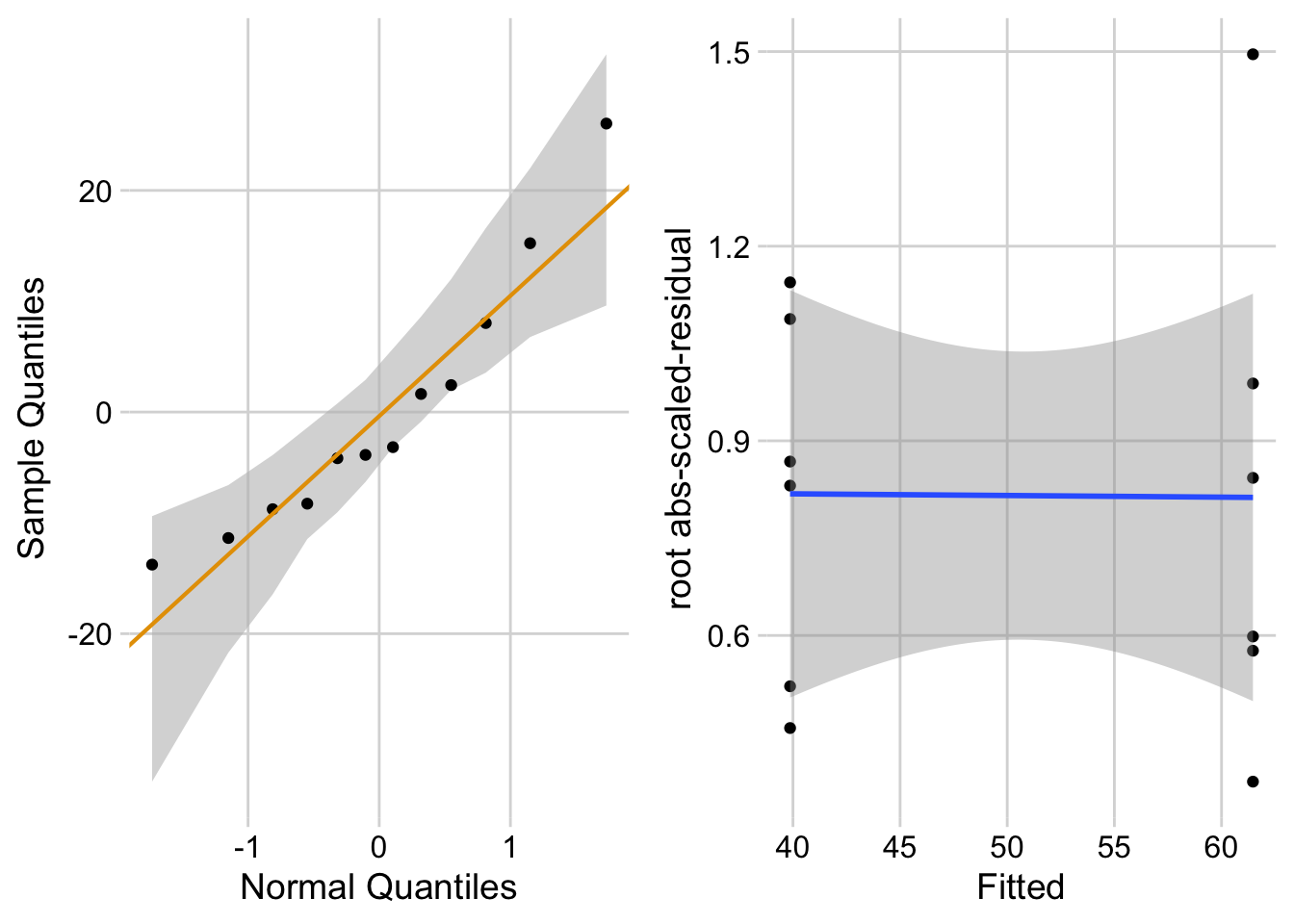 Our data look like they were sampled from a normal distribution because the points lie within the shaded boundary of the QQ plot (left panel). Our data look like they were sampled from distributions with the same variance because of the small tilt of the blue line in the Spread-Level plot (right panel). How to read these plots is covered in Chapter 11.