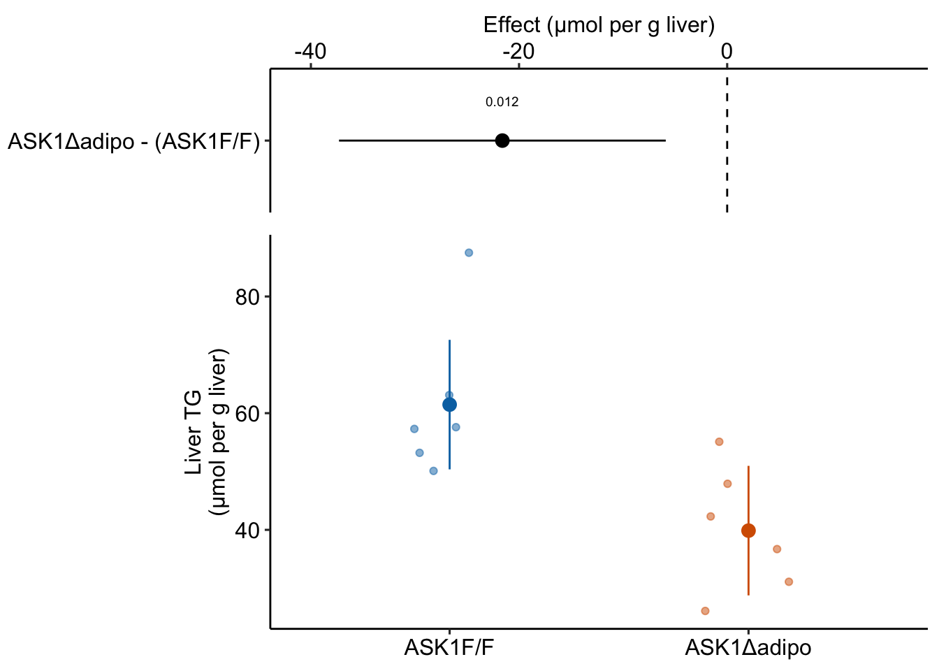 The estimate of the effect of adipose-specific ASK1 deletion on liver TG levels is the difference in the mean TG of the control group from the mean TG of the knockout group.